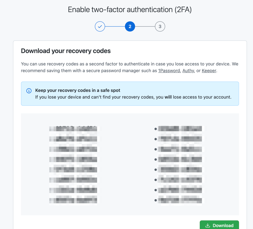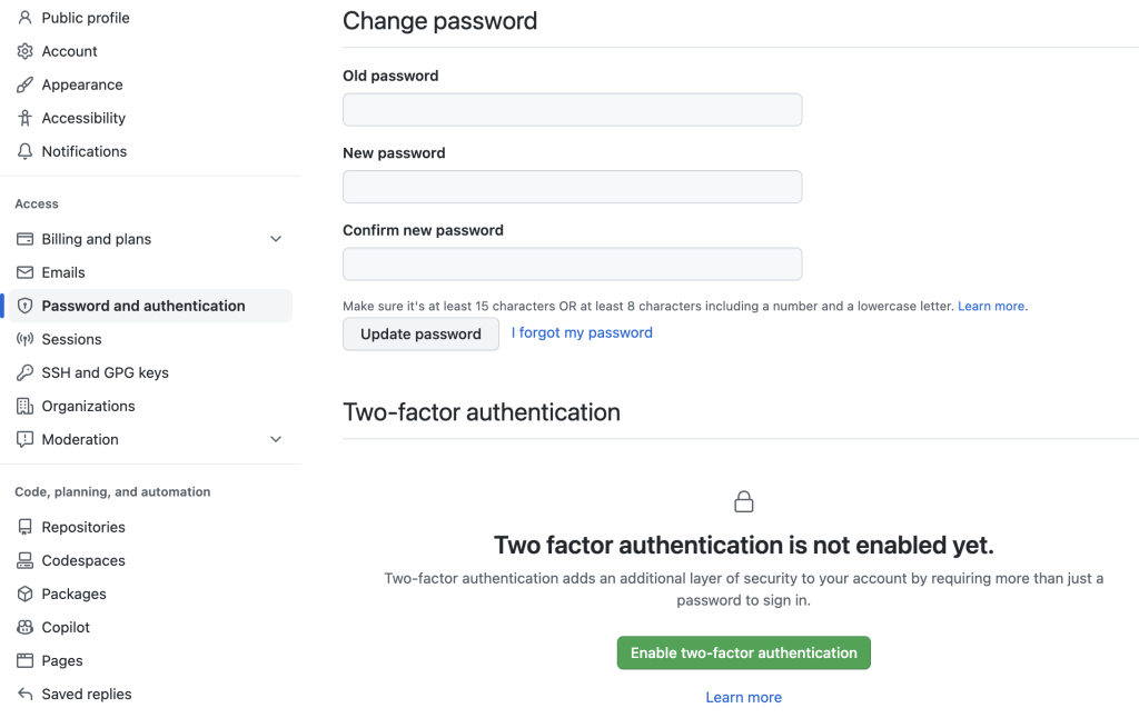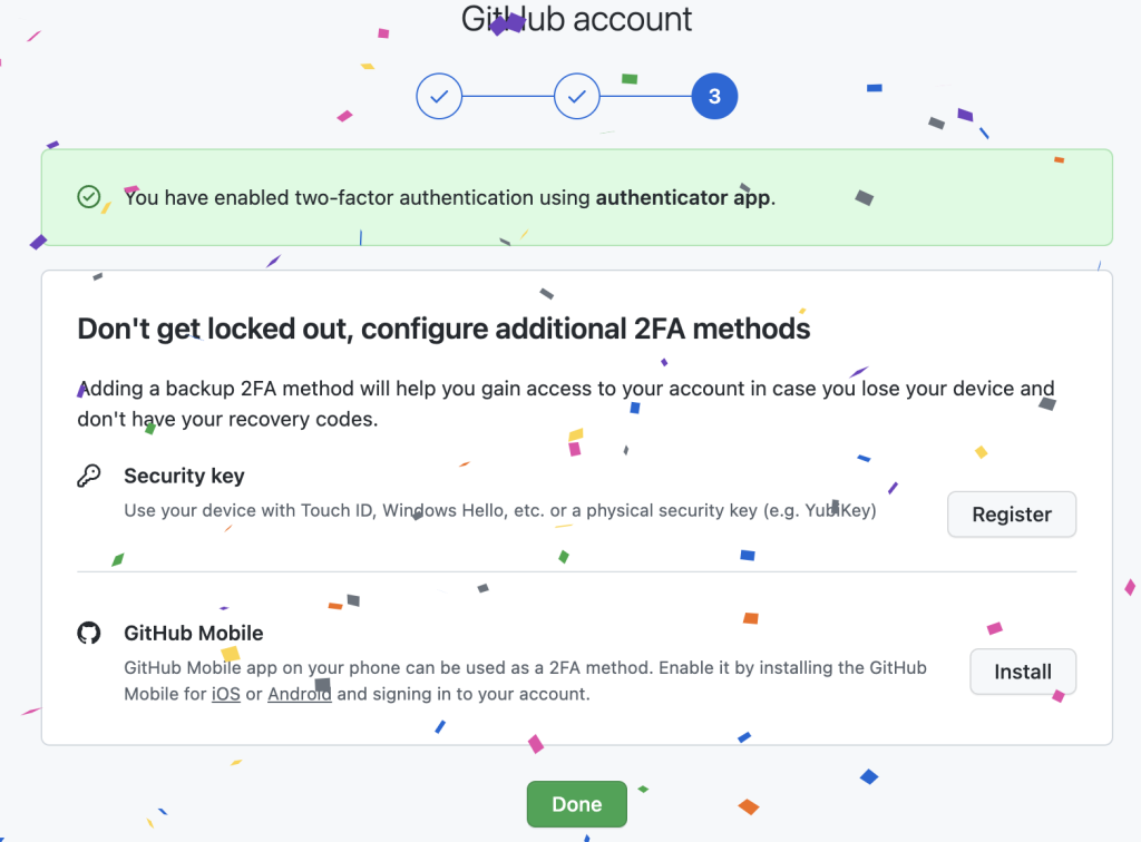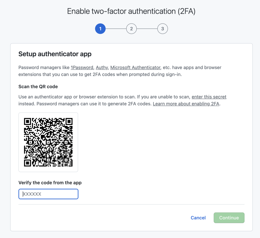 注: 2023 年 3 月から 2023 年末まで、GitHub では段階的に、GitHub.com でコードを投稿するすべてのユーザーに、1 つ以上の形式の 2 要素認証 (2FA) を有効にすることをお願いします。